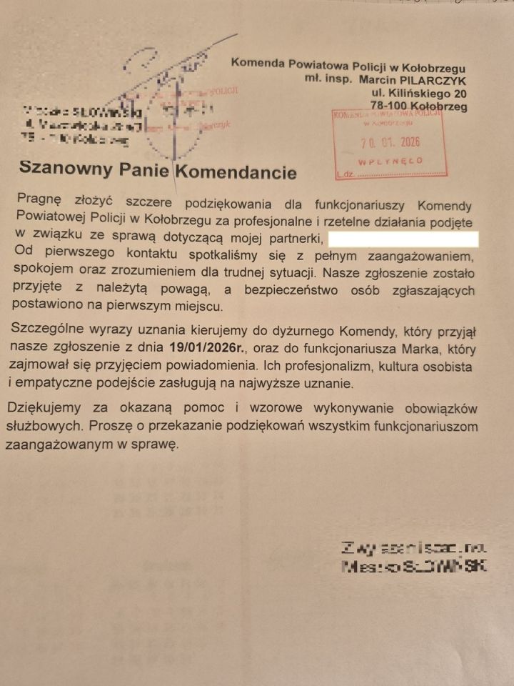 W nadesłanej wiadomości podkreślono, że policjant przyjmujący zgłoszenie wykazał się spokojem rzetelnością oraz empatycznym podejściem do trudnej sytuacji zgłaszającej. Zgłoszenie zostało potraktowane z należytą powagą a bezpieczeństwo pokrzywdzonej postawiono na pierwszym miejscu.