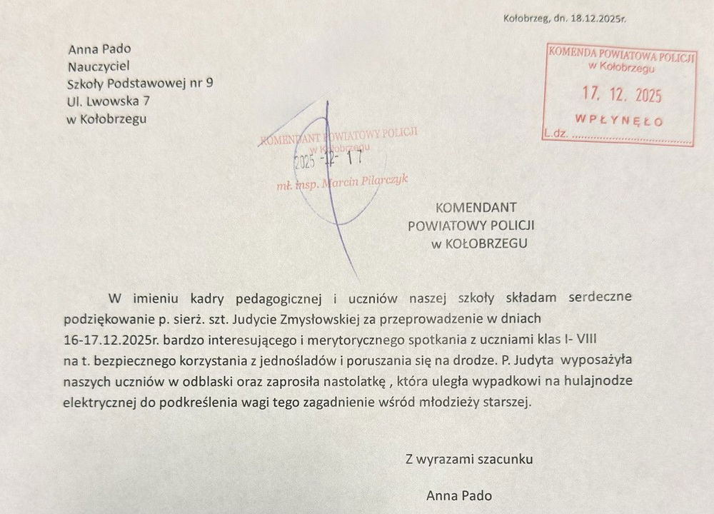 Do Komendy Powiatowej Policji w Kołobrzegu wpłynęło pisemne podziękowanie od Szkoły Podstawowej nr 9 za przeprowadzenie zajęć profilaktycznych dotyczących bezpieczeństwa w ruchu drogowym.