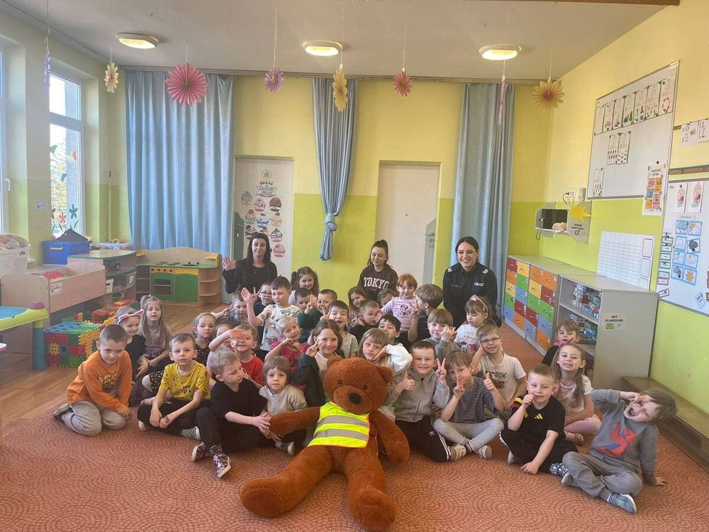 Miś Kołasek pomagał w zajęciach i wywoływał uśmiech u najmłodszych. Na zakończenie dzieci mogły z bliska obejrzeć elementy policyjnego wyposażenia i zrobić pamiątkowe zdjęcia.